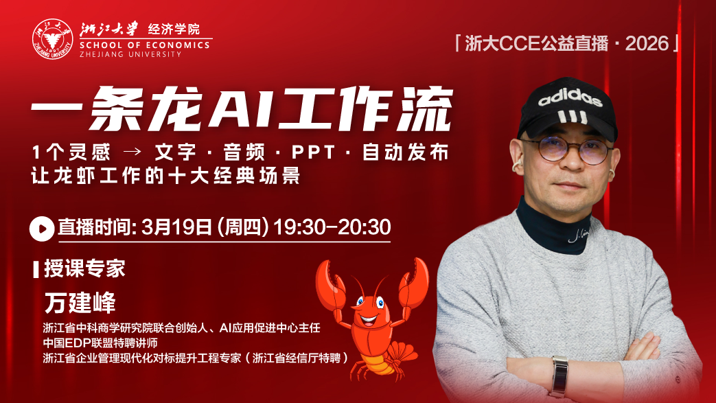 3月19日(周四)19:30-20:30,浙江大学经济学院进行公益直播,特别邀请浙江省中科商学研究院联合创始人、AI应用促进中心主任、中国EDP联盟特聘讲师万建峰,为大家分享《一条龙AI工作流:用一个灵感自动生成文字、音频、PPT,并自动发布公众号+让龙虾工作的十个经典场景》,也希望你能够在聆听中,找到自己的更多观点。