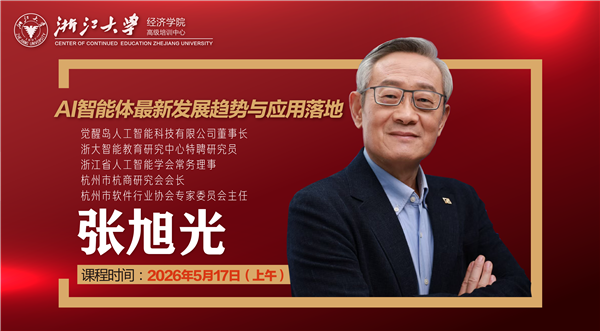 课程主题:AI智能体最新发展趋势与应用落地 课程时间:2026年5月17日(上午) 课程地点:浙江大学 授课老师:张旭光 觉醒岛人工智能科技有限公司董事长,浙大智能教育研究中心特聘研究员,浙江省人工智能学会常务理事,杭州市杭商研究会会长,杭州市软件行业协会专家委员会主任