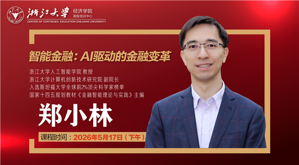 【浙大AI时代经营方略与企业创新高级研修班课程】 课程主题:智能金融:AI驱动的金融变革 课程时间:2026年5月17日(下午) 课程地点:浙江大学 授课老师:郑小林 浙江大学人工智能学院教授,浙江大学计算机创新技术研究院副院长,入选斯坦福大学全球前2%顶尖科学家榜单,国家十四五规划教材《金融智能理论与实践》主编